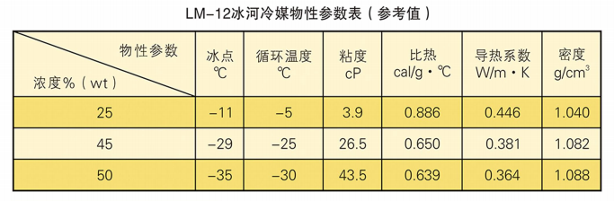 本品適用于保鮮庫、冷藏庫、低溫庫做間接制冷載冷劑使用。使用時先將系統(tǒng)清洗干凈,然后根據(jù)庫溫將本品加水稀釋到指定濃度使用,具體使用濃度及物性參數(shù)參考下表。
